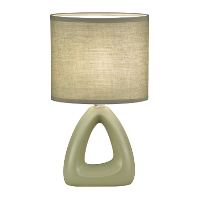 Настольный светильник с питанием от сети 220В. Материал корпуса - керамика, абажур из ткани. Цоколь Е14, может использоваться с лампами накаливания, светодиодными лампами. Длина кабеля 1,3м, выключатель на кабеле питания, цвет кабеля белый. Высота 30см, овальный абажур 17х10см.